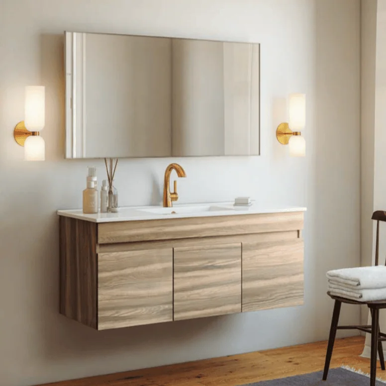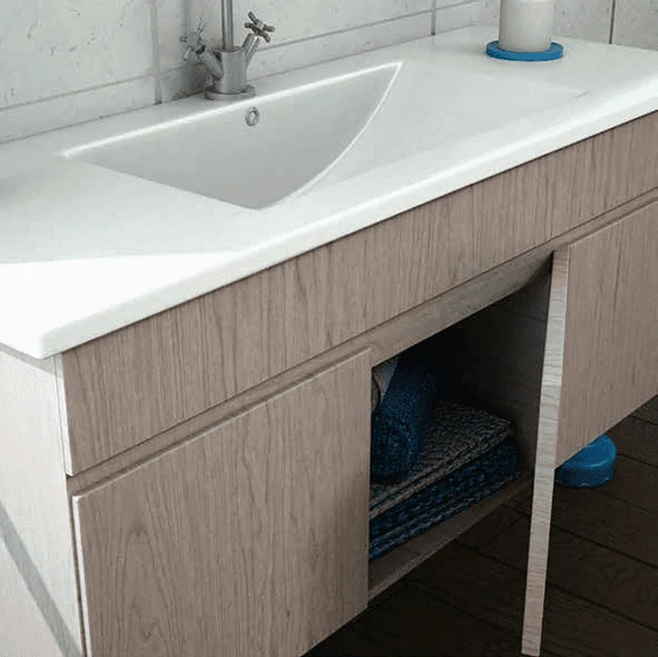 🌿 מראה טבעי ונקי – ארון אמבטיה תלוי דגם אינטגרלי בגוון אלון. כולל שתי דלתות, משטח חרס ומראה מרחפת תואמת.