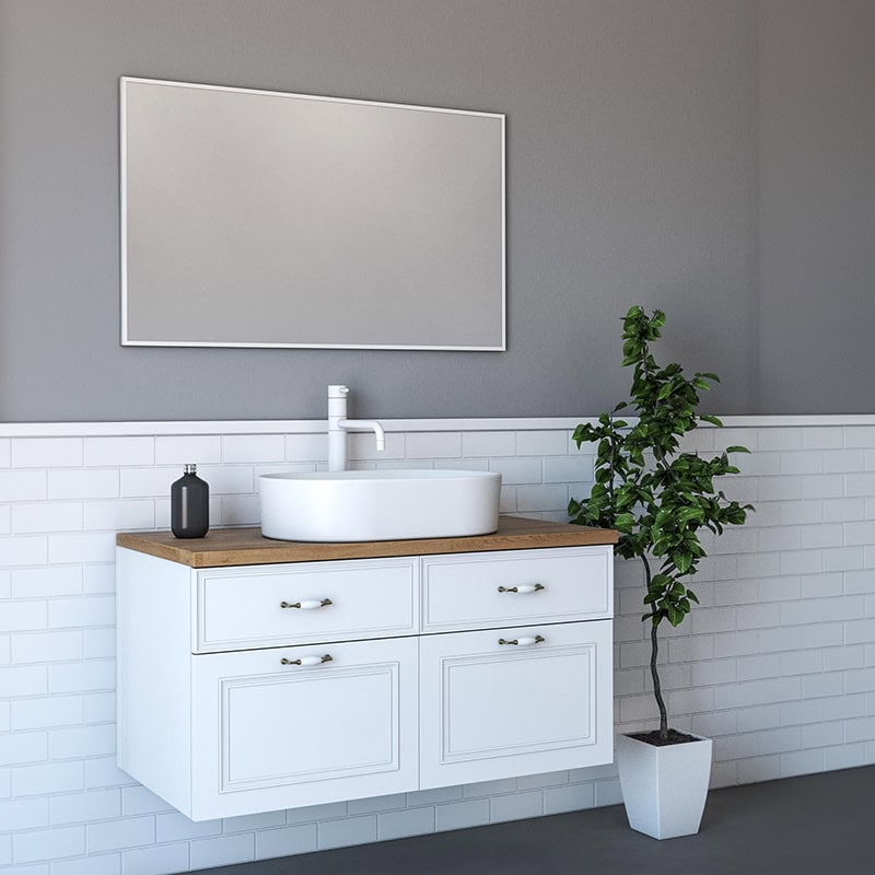 ארון אמבטיה דגם טוסקנה בגודל 100 ס"מ, כולל ארבע מגירות טריקה שקטה וכיור חרס אינטגרלי. בעיצוב יוקרתי ומרחף – לשילוב מושלם בין סטייל לפרקטיקה.