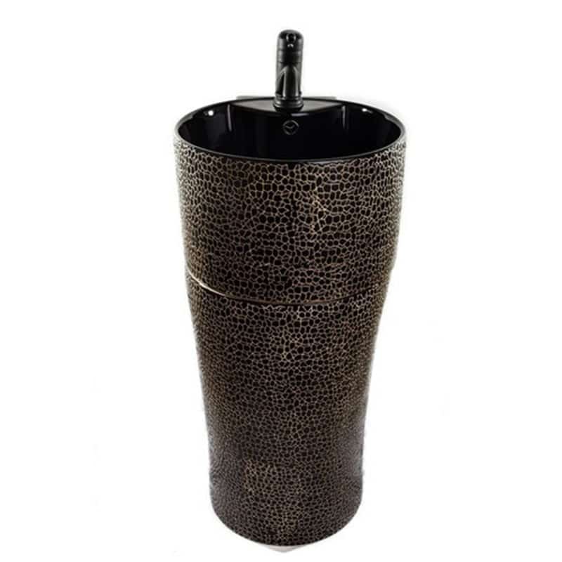 כיור חרס עומד יוקרתי בשחור עם שילוב זהב כסוף מבריק במידות 41X41X82 ס"מ עם חור מוכן לברז. מציע מראה דרמטי ומלכותי לחדר הרחצה עם שילוב צבעים מתכתי מרהיב ויוקרתי.