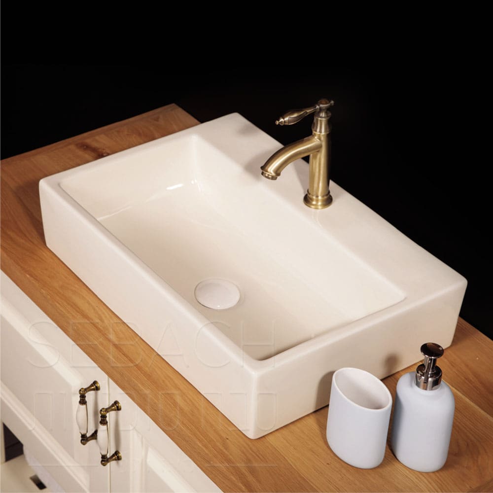 כיור מונח אובלי דגם ורד מחרס איכותי בגימור לבן במידות 51x36x12 ס"מ. עיצוב רומנטי ועדין עם פרופיל דק במיוחד היוצר מראה מרחף ומינימליסטי על משטח הארון.