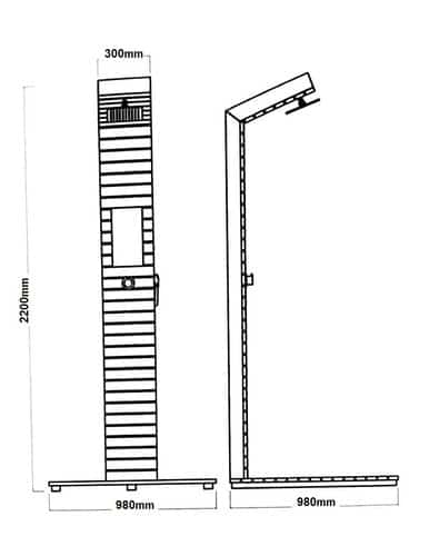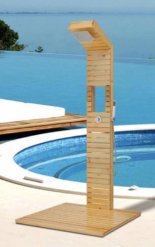 מערכת רחצה יוקרתית לגינה מעץ מלא עמיד במים וחום קיצוניים. כוללת משטח עץ תחתון, ראש טוש מרובע 20X20 ס"מ, בורר מצבים ומזלף רחצה לחוויה טבעית ומודרנית בחוץ.