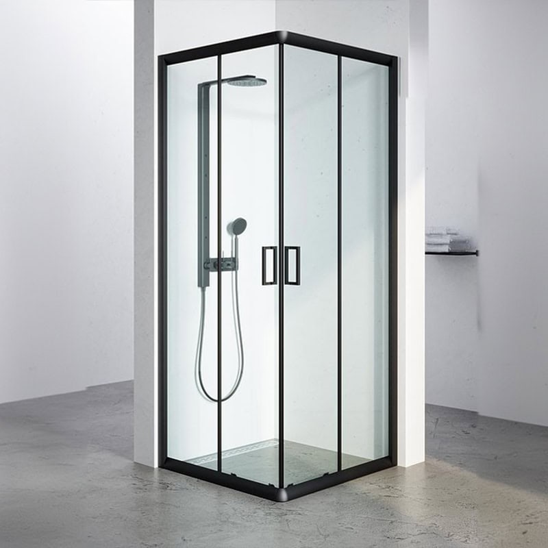 שתי דלתות הזזה נעות על מסילה חלקה בין שתי דפנות קבועות. זכוכית מחוסמת בגימור שקוף או פסים, פרופיל שחור עמיד, וגלגלים כפולים לפתיחה שקטה ונוחה.