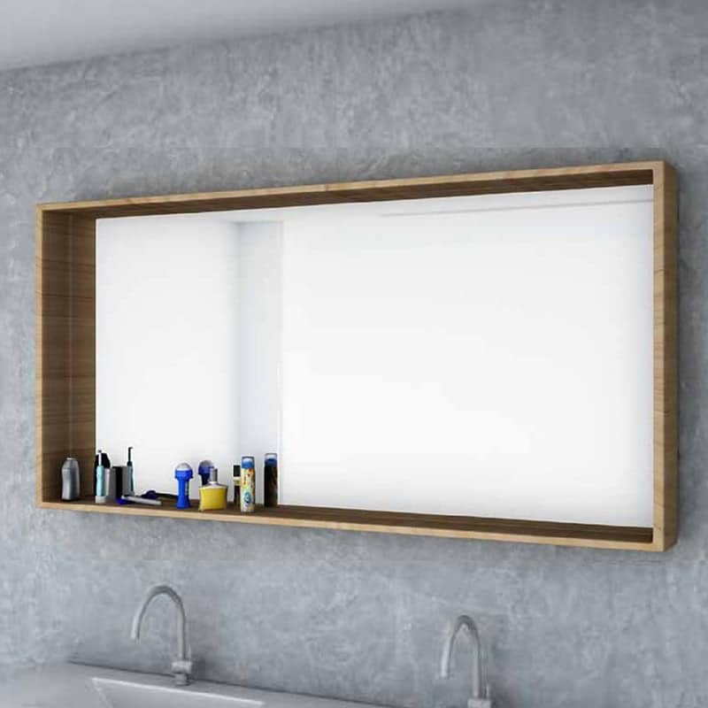 מראה מרחפת עם מדף פורניר איכותי, זמינה במידות 60, 80, 100 ו-120 ס"מ. שילוב מושלם של פונקציונליות ועיצוב טבעי עם מדף נוח לאחסון חפצים קטנים בחדר הרחצה.