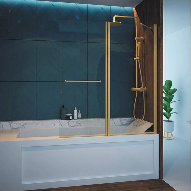 אמבטיון 120 ס"מ עם דופן קבועה ודלת נפתחת בגימור זהב  – פתרון קלאסי ונוח עם פרופיל אלומיניום, ציר חכם לאטימה מקסימלית וידית מגבת אינטגרלית. עיצוב פרקטי ואלגנטי.