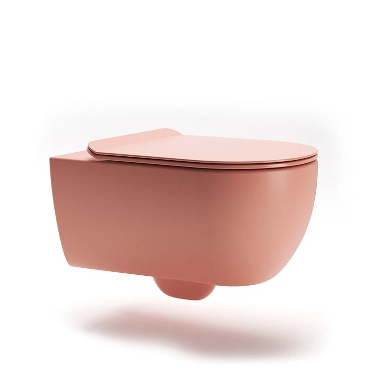אסלת טונדו תלויה בגימור ורוד מט עם מושב הידרואלי דק וטריקה שקטה – פתרון ייחודי ואלגנטי לחדר הרחצה.