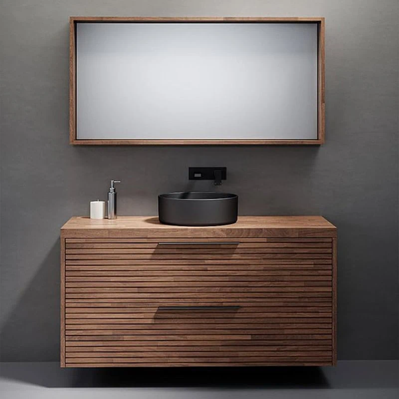 ארון אמבטיה תלוי מעץ אלון מלא עם שתי מגירות ומשטח בוצ'ר עבה – מראה טבעי ואלגנטי בחדר הרחצה.