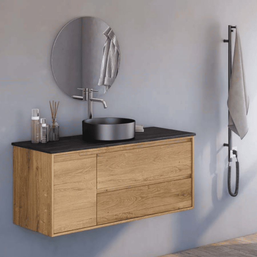 ארון אמבטיה תלוי דגם טנריף בגודל 80 ס"מ עם שתי מגירות ודלת בגימור פורניר טבעי, כולל משטח תואם – פתרון פרקטי ואסתטי לחלל הרחצה.