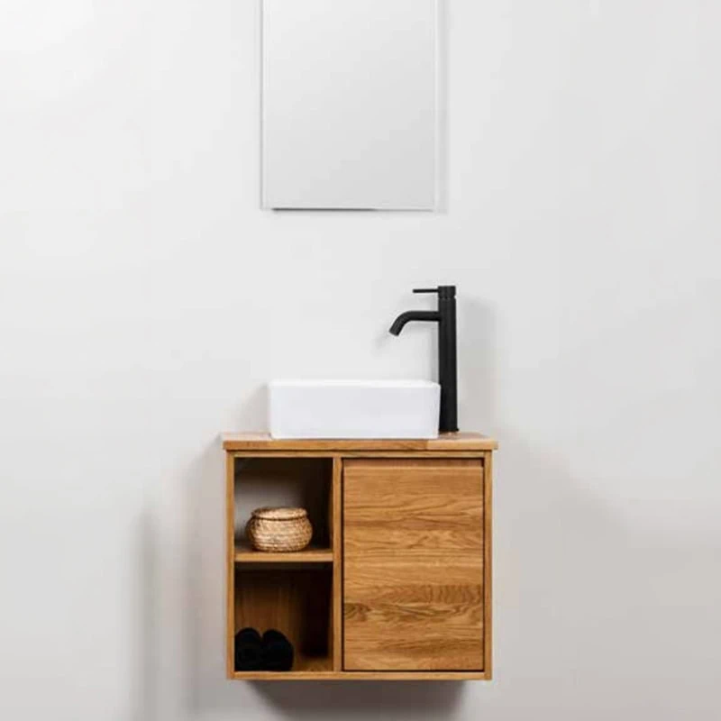 ארון אמבטיה דגם מיני פיקולי בגודל 60 ס"מ בעיצוב קומפקטי, עם דלת אחת, שני תאים, משטח בוצ'ר, כיור מונח וברז גבוה שלומו 702830 – מושלם לחללים קטנים.