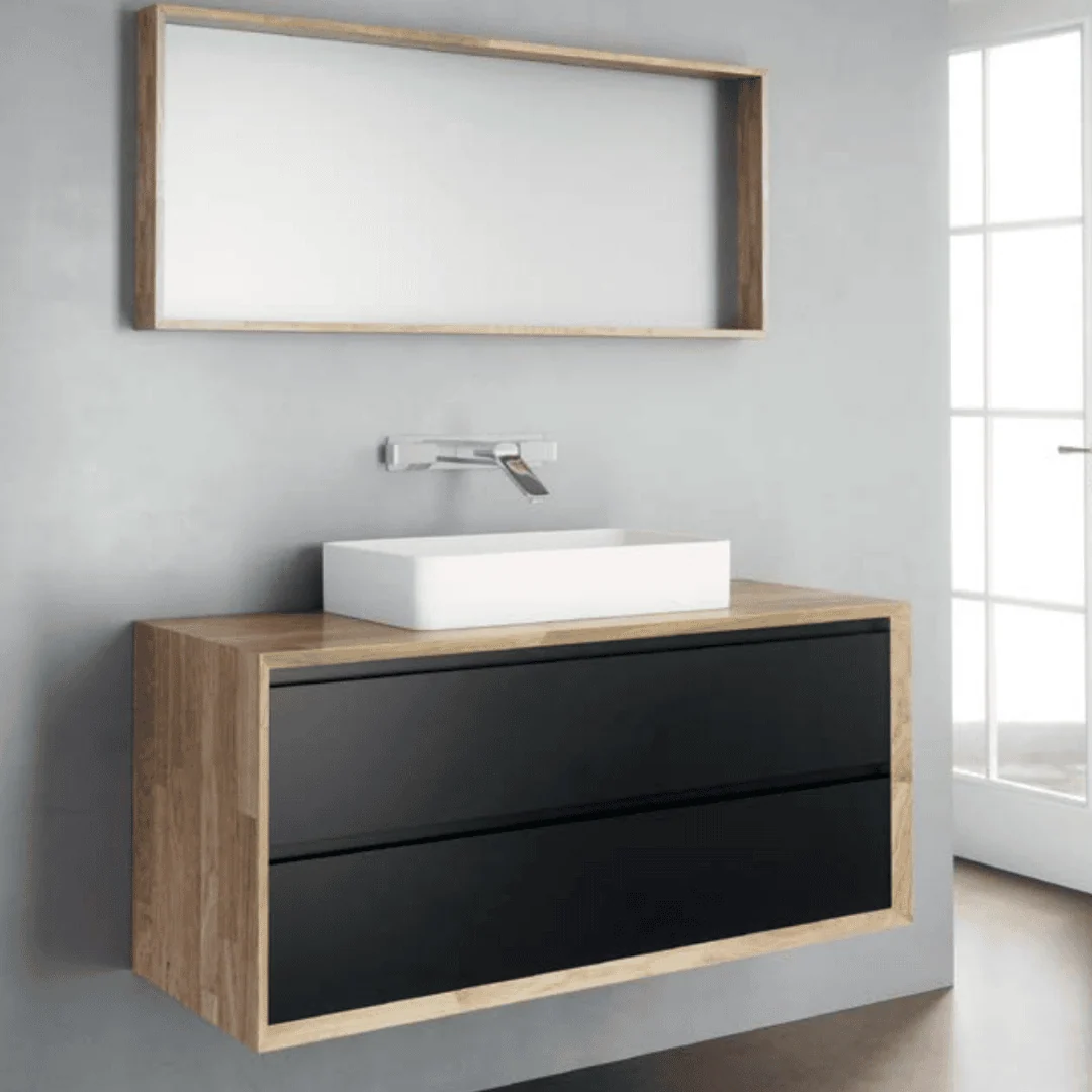 ארון אמבטיה תלוי דגם סהרה בגודל 120 ס"מ עם גוף ומשטח בוצ'ר עץ אלון וחזיתות בגימור אפוקסי – שילוב בין טבעיות לעיצוב מודרני ומוקפד.