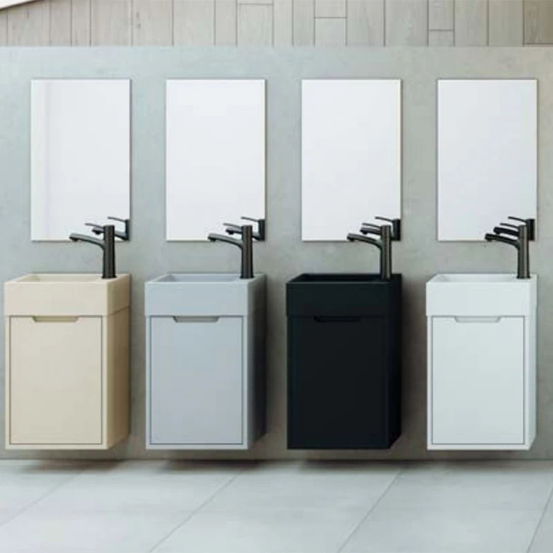 ארון אמבטיה קומפקטי דגם סנטנדר בגימור אפוקסי, עם דלת אחת ומשטח חרס אינטגרלי מדגם מילאנו. פתרון אלגנטי לחדרי רחצה צרים.