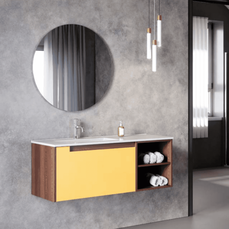 ארון אמבטיה תלוי דגם פביאן בגודל 90 ס"מ עם חזית מגירה דאבל גלריה אפוקסי, גוף ותאים פתוחים מפורניר אלון – אידיאלי למראה טבעי ומודרני בחדר הרחצה.