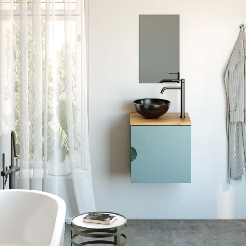 ארון אמבטיה תלוי דגם רונדה בגודל קומפקטי של 40 ס"מ. כולל דלת אחת בגימור אפוקסי, גוף סנדוויץ', ומשטח בוצ'ר אלון טבעי – אידיאלי לחללים קטנים.