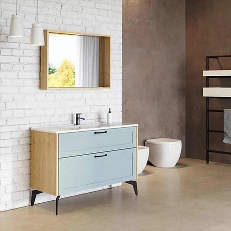 ארון אמבטיה ג'יני 60 ס"מ – עיצוב עומד עם גוף פורניר עץ אלון, חזיתות אפוקסי בצבע Feathery, שתי מגירות איכותיות, וכיור חרס אינטגרלי למראה נקי ומודרני.
