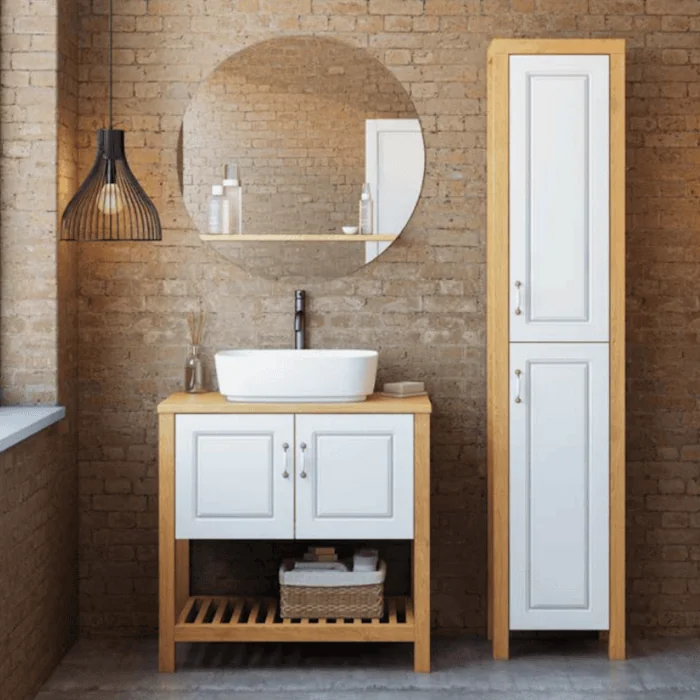 ארון אמבטיה דגם אבידוס בגודל 60 ס"מ. כולל שתי דלתות, משטח עץ בוצ’ר, סט מגבות מעץ אלון מלא ומראה עומד בעיצוב מרחף. מגיע ללא כיור.