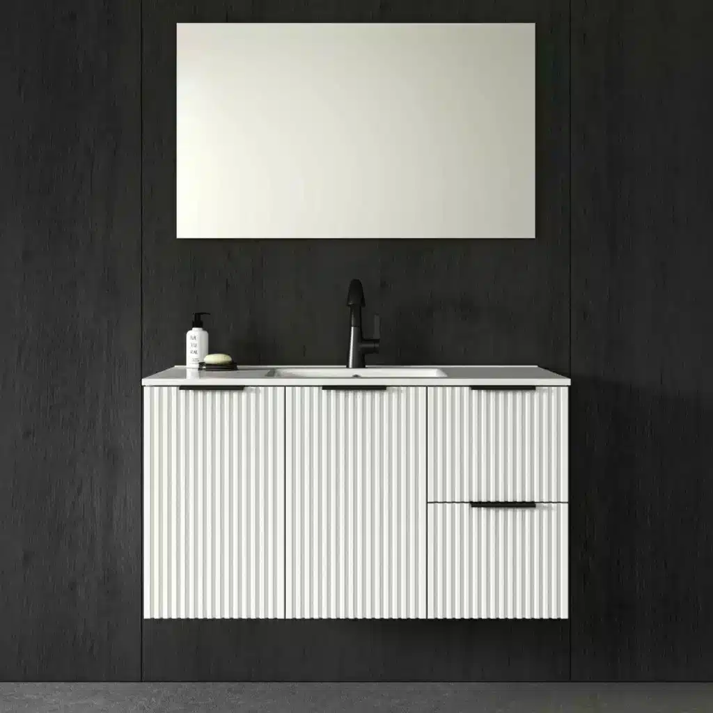 הגוף עשוי סנדוויץ' איכותי בגימור לבן מט, כולל משטח חרס עמיד בפני מים ומראה מרחפת שמשלימה את המראה האלגנטי של חדר הרחצה.