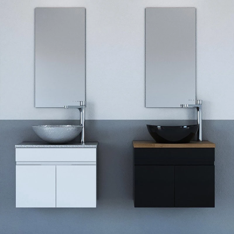 ארון אמבטיה תלוי בגודל 60 ס"מ עומק 40, עם שתי דלתות, ברז ניקל גבוה וכיור מונח לבחירה. מתאים למי שמחפש שילוב של עיצוב יוקרתי ונוחות בחלל הרחצה.