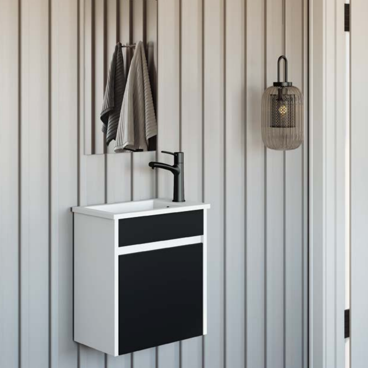 ארון אמבטיה תלוי קומפקטי עם דלת אחת ומשטח חרס, בעיצוב מרחף. פתרון מושלם לאחסון בסיסי בחדרי רחצה קטנים במיוחד.