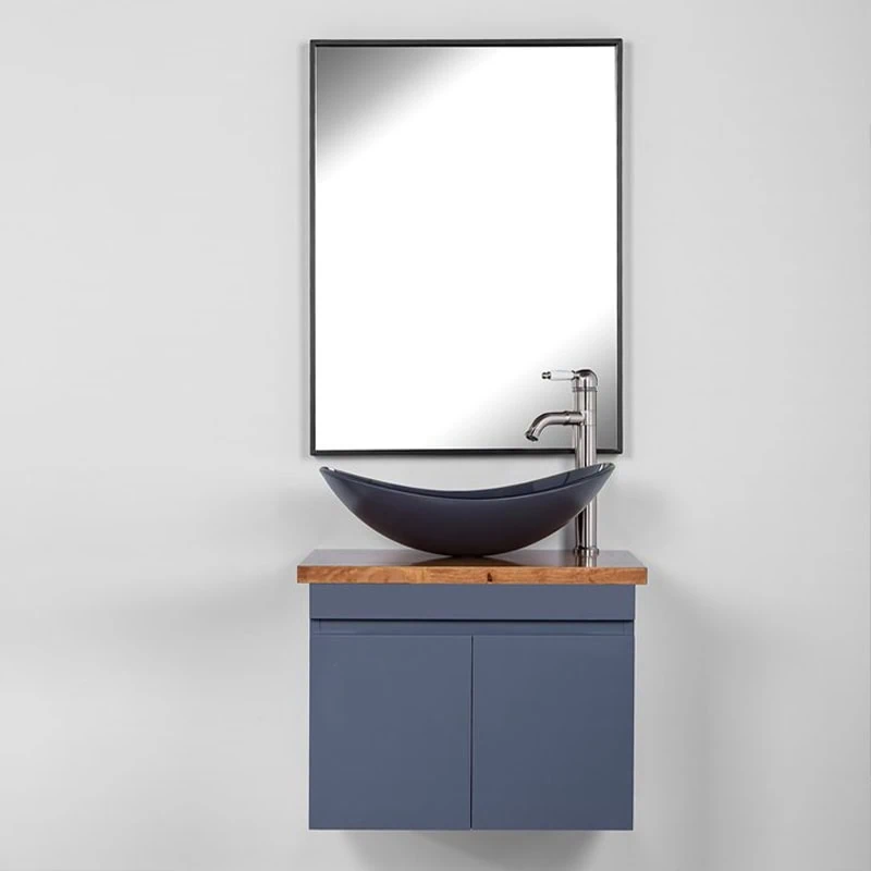 ארון יהלום בגימור אפור מט עם משטח עץ בוצ'ר, כיור זכוכית שחור וברז ניקל מוברש – עיצוב יוקרתי לפינת הרחצה.