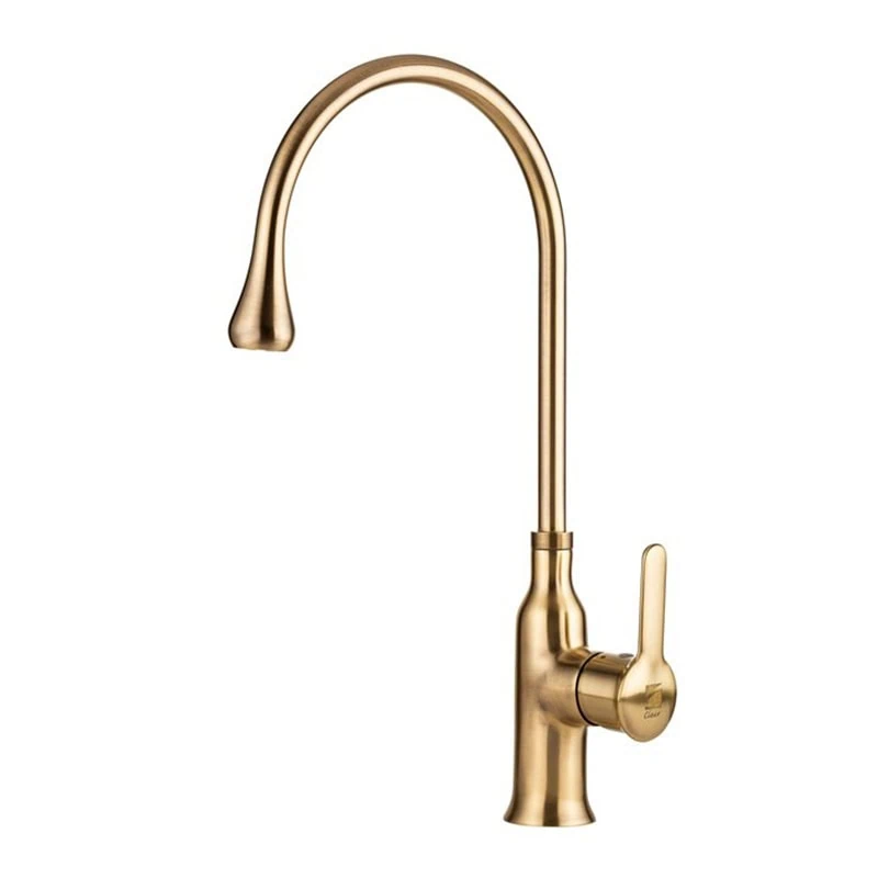 ברז פרח עם פיה קבועה בגימור ברונזה צהובה, עיצוב מרשים ועמידות גבוהה. כולל רשת סינון איכותית, תקן CUPC ואחריות רחבה – הבחירה המושלמת למטבח עם נוכחות.