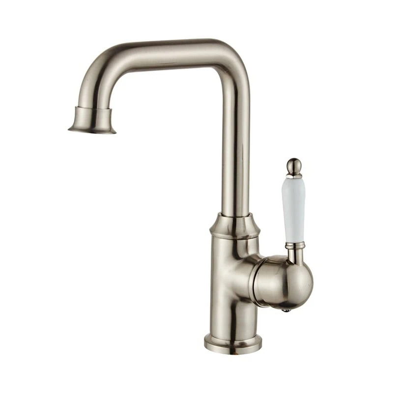 ברז פרח בעיצוב קלאסי עם פיה מסתובבת וידית בירה בשילוב ניקל מוברש ולבן. כולל חיבור למים חמים וקרים ואחריות ל-7 שנים – עיצוב ופונקציונליות בחבילה אחת.
