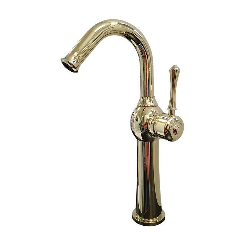 ברז פרח גבוה בסגנון ענתיק עם פיה מסתובבת, בגימור זהב אלגנטי. מתאים לכיורים מונחים, כולל חיבור למים חמים וקרים ואחריות של 7 שנים – שילוב של פרקטיות ונוכחות עיצובית.