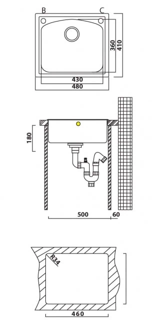 מידות מדויקות: כיור 48 ס"מ רוחב, 41 ס"מ אורך, 18 ס"מ עומק – מידות אופטימליות לעיצוב חכם