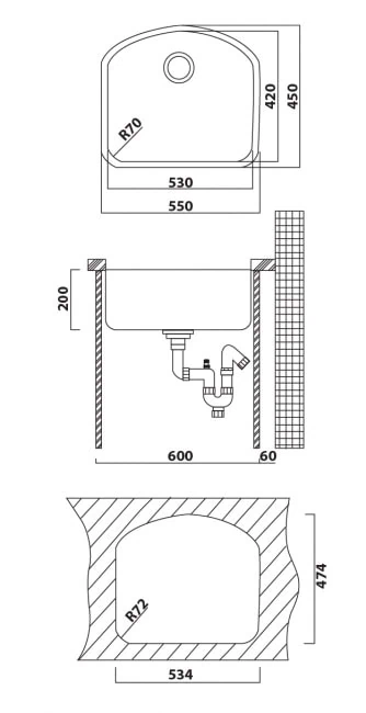סוג: כיור מטבח יחיד בעיצוב חצי עיגול ייחודי ואלגנטי