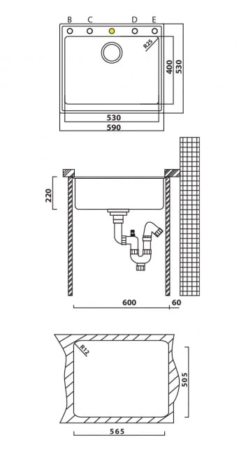 מידות מדויקות: כיור 59 ס"מ רוחב, 53 ס"מ אורך – מידות אידיאליות לכל סוג מטבח