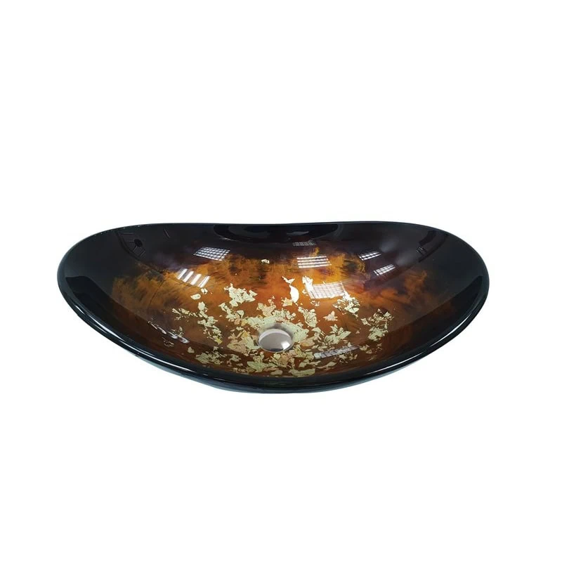 כיור מונח זכוכית בגימור עלים שחורים אמנותי – עיצוב זכוכית ייחודי עם דוגמת עלים במידות 54×36 ס"מ, ליצירת אלמנט דקורטיבי מרשים בחדר הרחצה.