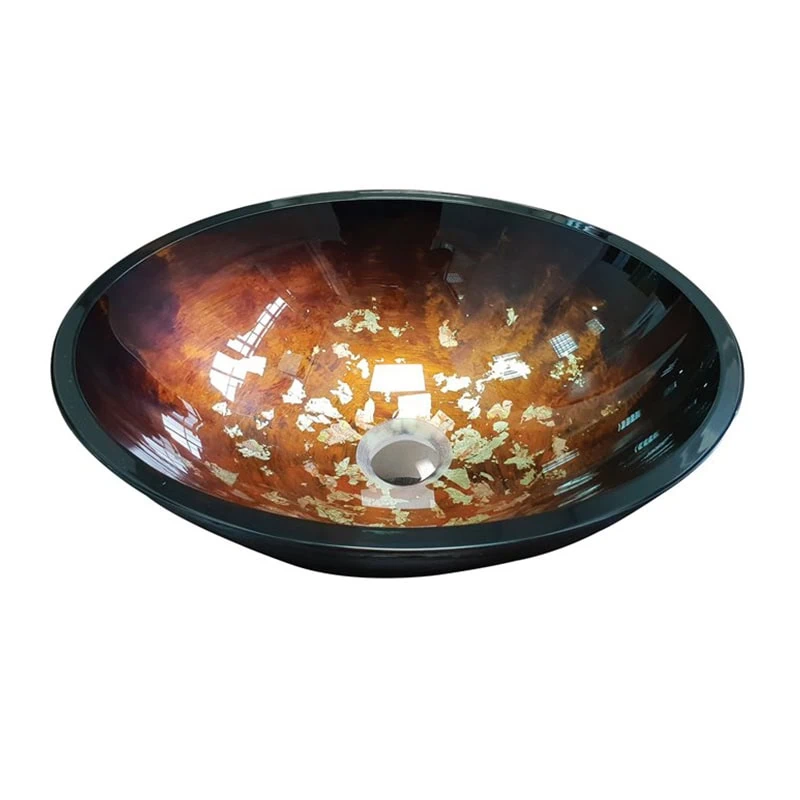 כיור מונח זכוכית בגימור עלים שחורים אמנותי – עיצוב זכוכית ייחודי עם דוגמת עלים במידות 41×33 ס"מ, ליצירת אלמנט דקורטיבי מעודן בחדר הרחצה.