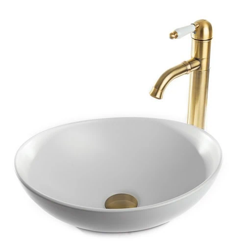 כיור מונח חרס בגימור לבן מבריק קלאסי – עיצוב אובלי זמני במידות מדויקות, משלב אלגנטיות נצחית עם פונקציונליות מושלמת.
