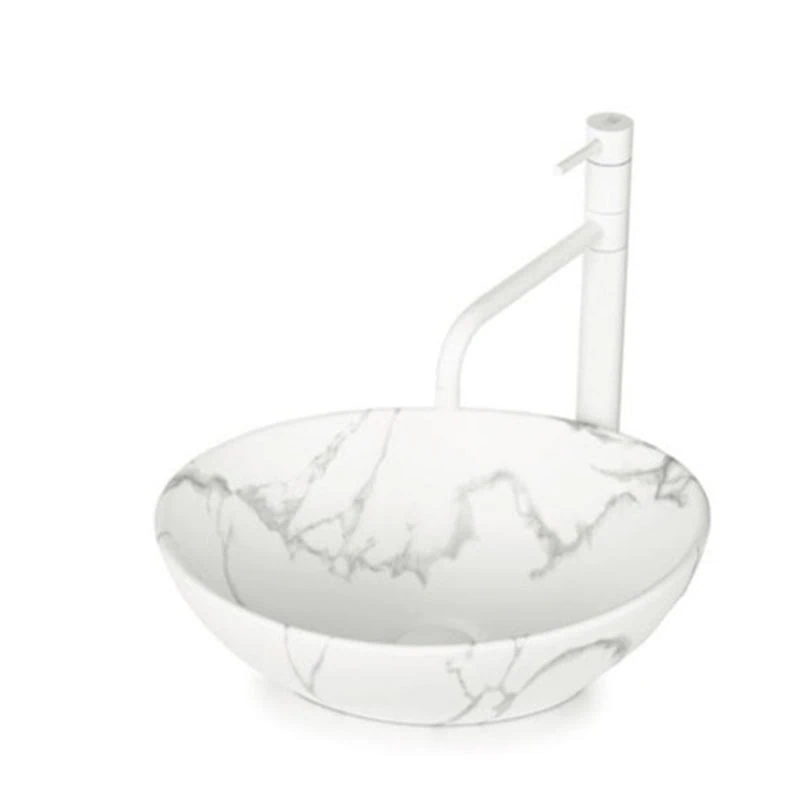 כיור מונח חרס בגימור קלקטה לבן מט – עיצוב אובלי מעודן במידות אידיאליות, משלב אלגנטיות עם פונקציונליות למרחב רחצה מתוחכם.