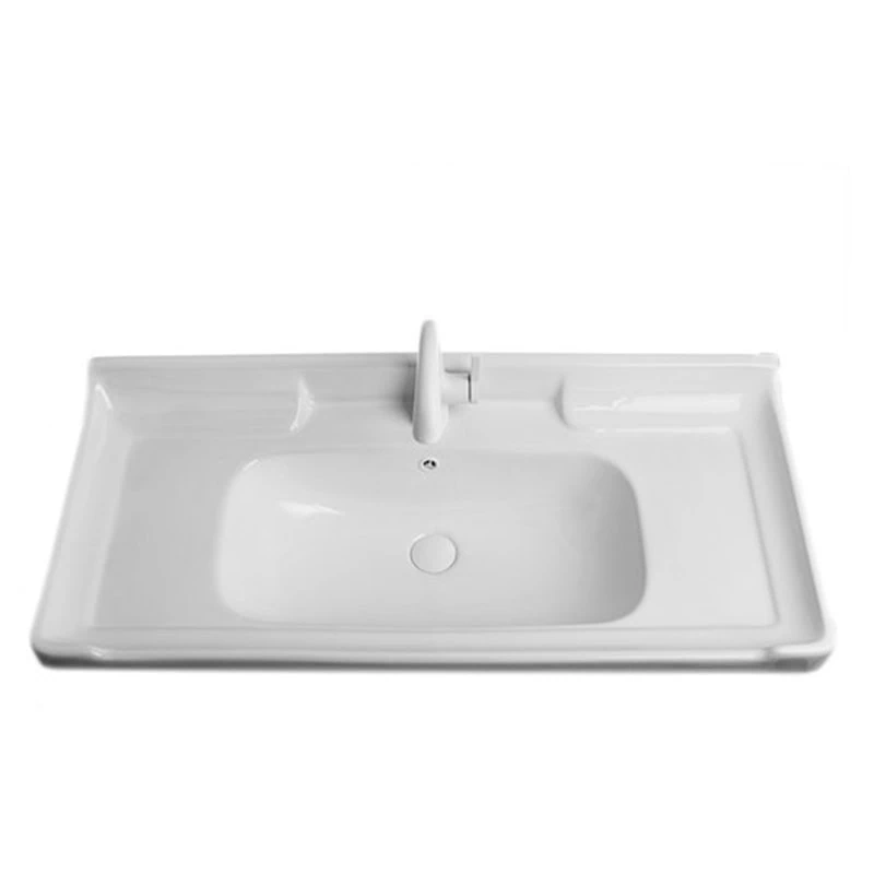 כיור חרס אינטגרלי עם שפה עבה מעוצבת בגוון לבן מבריק, במידות 100X47 ס"מ. שילוב קלאסי של גימור לבן מבריק עם פרטי עיצוב עתיקים המעניק מראה יוקרתי ונקי לחדר הרחצה.