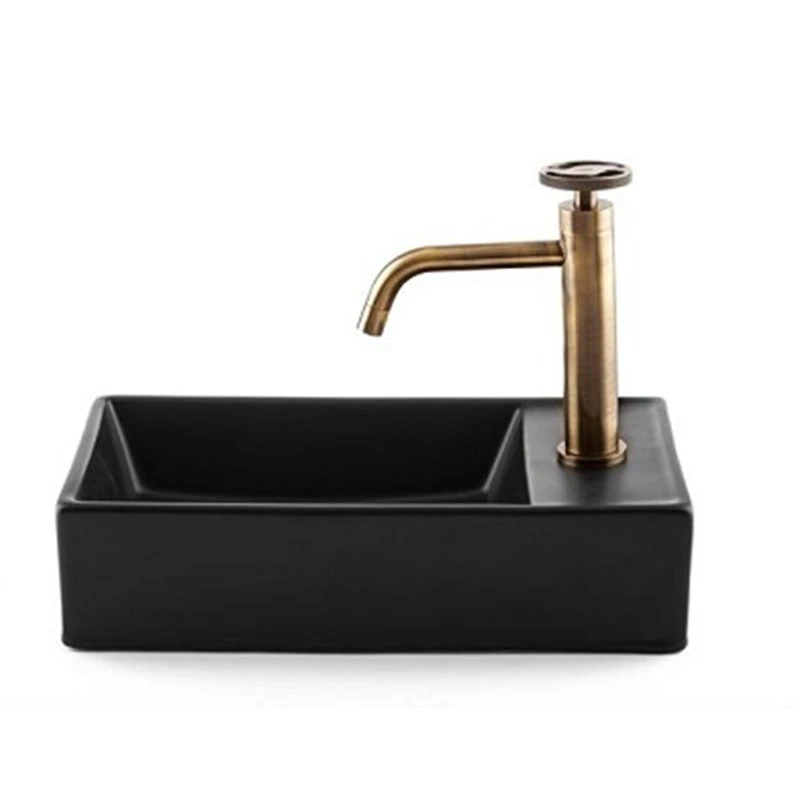 כיור חרס קומפקטי בגימור שחור מט – עיצוב מלבני דק ואלגנטי הניתן להתקנה כמונח או תלוי, מושלם לחללים מינימליסטיים.
