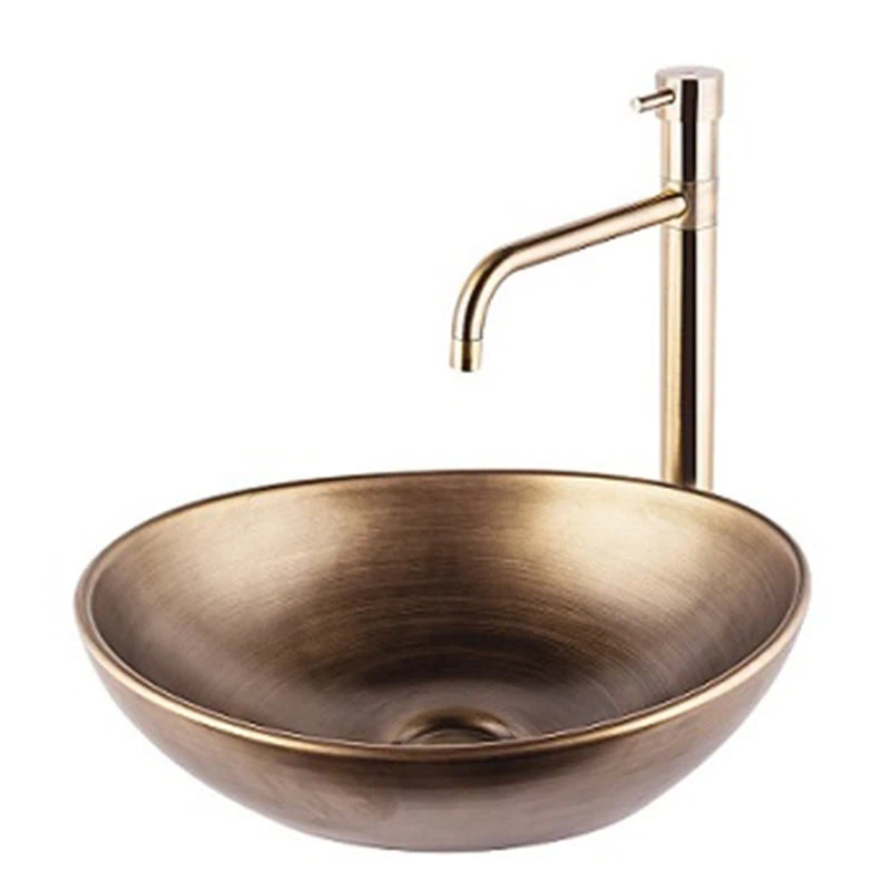 כיור מונח חרס בגימור ברונזה צהובה חם ומעוצב – עיצוב מתוחכם עם נוכחות וינטאג' עדינה, מוסיף נגיעה קלאסית ויוקרתית לחדר הרחצה.