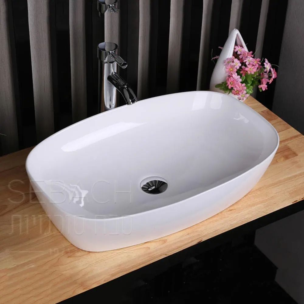 כיור מונח אובלי דגם מעיין מחרס איכותי בגימור לבן במידות 60x40x14 ס"מ. עיצוב אובלי טבעי ומרווח עם קווים אורגניים המזכירים זרימת מים. פתרון נוח ויפה המשלב בין רוחב מעשי לעיצוב מעודן וחמים.