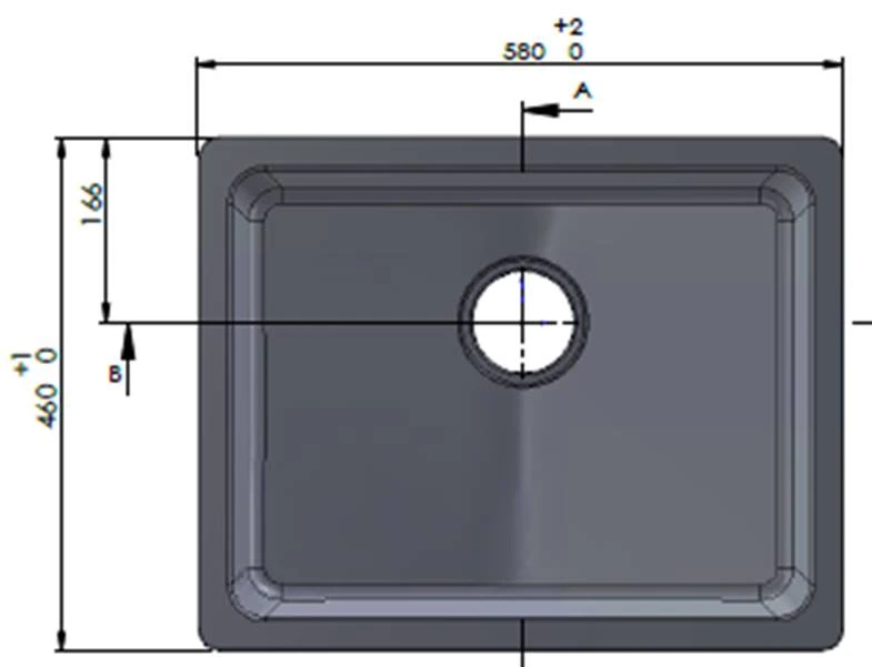 מידות מדויקות: כיור 58 ס"מ רוחב, 46 ס"מ אורך, 20 ס"מ עומק