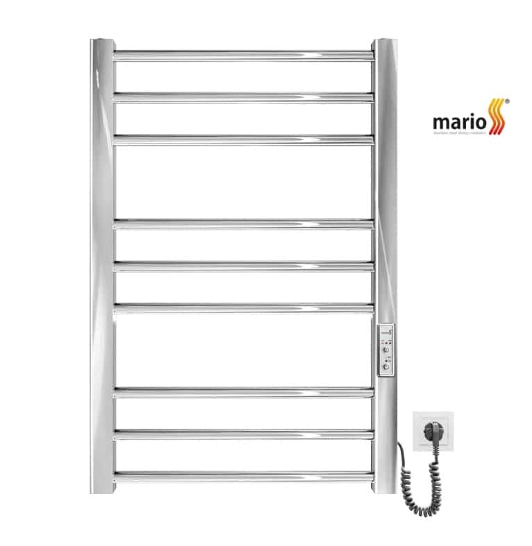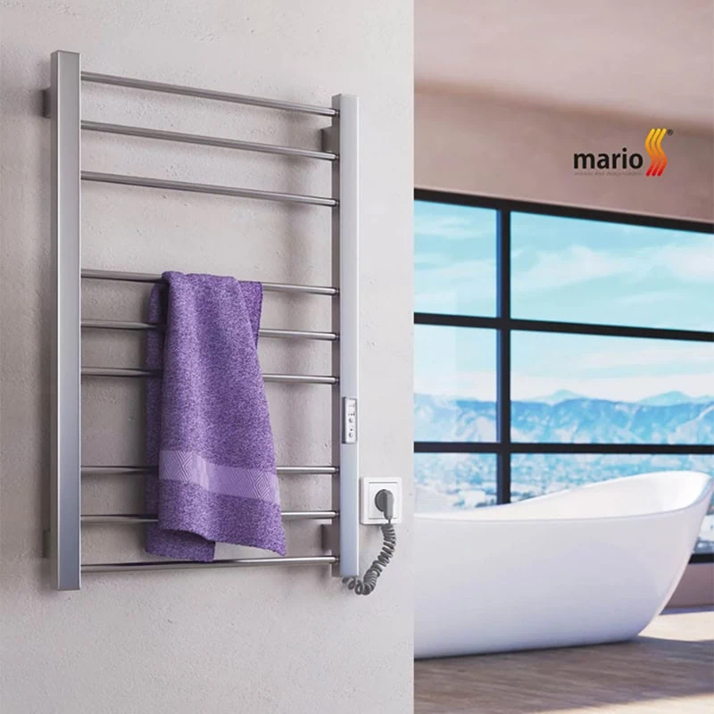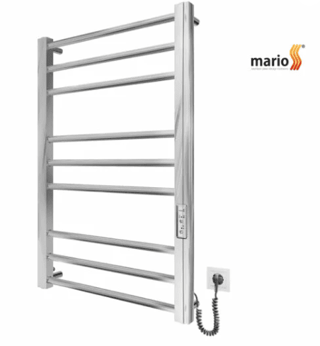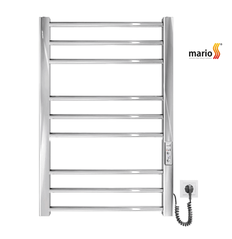 מחמם מגבות חשמלי Mario באיכות אירופאית מעולה עם גופי נירוסטה 304 בגוון כרום מבריק. מאובזר בתרמוסטט 3 מצבים, טיימר ל-3/6 שעות וחיבור גמיש. הספק 120W חסכוני לחימום 45-55 מעלות עם הגנה IP44.