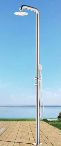 מערכת רחצה יוקרתית לגינה במתכת עם גימור ניקל מבריק. כוללת אינטרפוץ 3 דרך בראס, בורר מצבים, מזלף 3 מצבי זרימה וראש טוש עגול 20 ס"מ לחוויית רחצה נוחה ויוקרתית בחוץ.