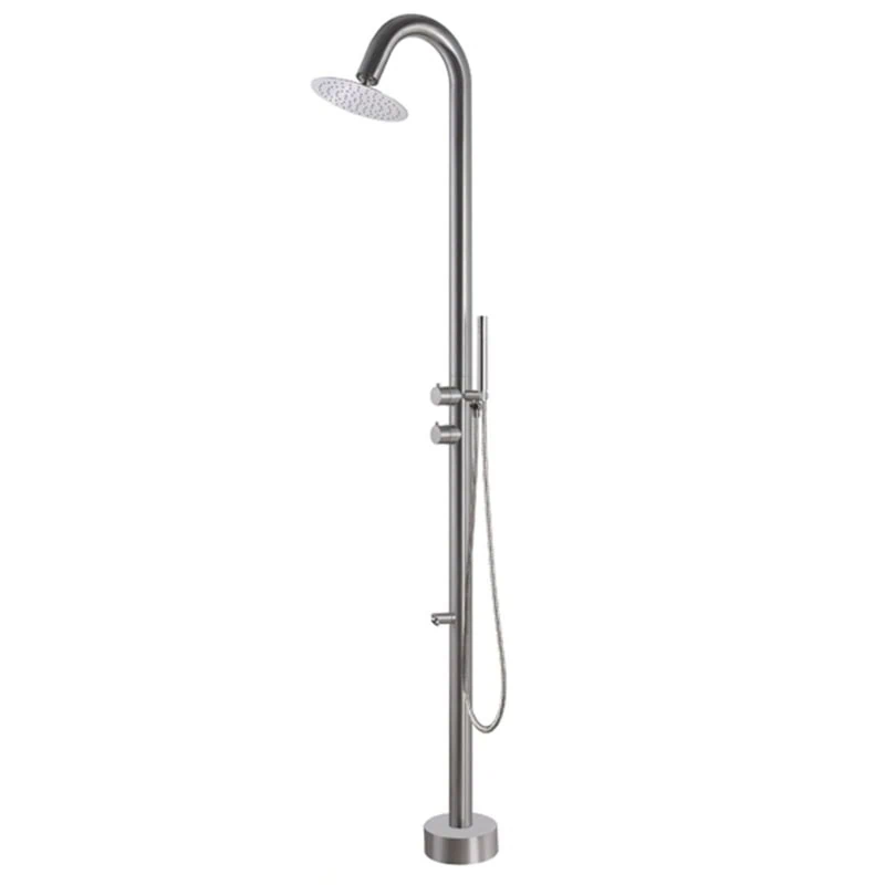 מערכת רחצה יוקרתית לגינה מעץ מלא עמיד במים וחום קיצוניים. כוללת אינטרפוץ מובנה, ראש טוש עגול 20 ס"מ, בורר מצבים ומזלף רחצה לחוויה מפנקת בחוץ.