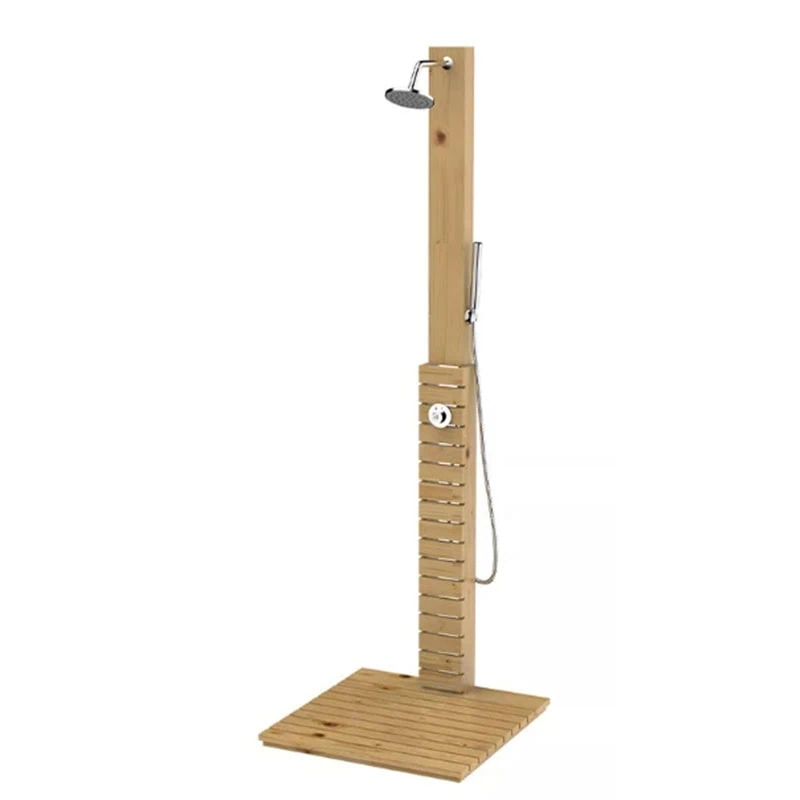 מערכת רחצה יוקרתית לגינה מעץ מלא עמיד במים וחום קיצוניים. כוללת משטח עץ תחתון, ראש טוש עגול 20 ס"מ, בורר מצבים ומזלף רחצה לחוויה טבעיות ומפנקת בחוץ.