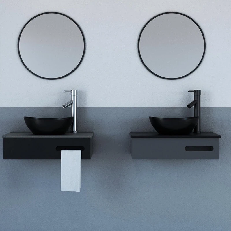 סט תלוי מדויק ואיכותי בעיצוב מודרני – כולל כיור חרס מונח, ברז תואם ומשטח זכוכית או גרניט פורצלן לבחירה. מתאים במיוחד לשירותי אורחים או חדרי רחצה קטנים.