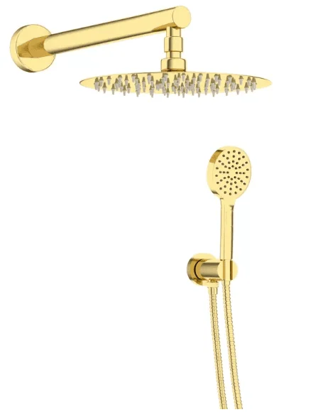 סט מקלחת מלא 5 חלקים בגימור זהב מבריק יוקרתי. כולל ראש מקלחת 25 ס"מ, מזלף 3 מצבים, נקודת מים עם תופסן, צינור 150 ס"מ וזרוע עגולה לחוויית רחצה מלכותי ומפואר במיוחד.
